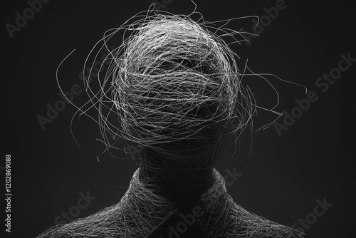 A surreal, monochromatic figure with a head made of tangled fibers, evoking themes of identity and confusion against a dark backdrop.