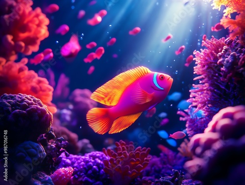 A surreal underwater scene with glowing, multicolored coral and neon fish, visualizing an imaginative ocean world