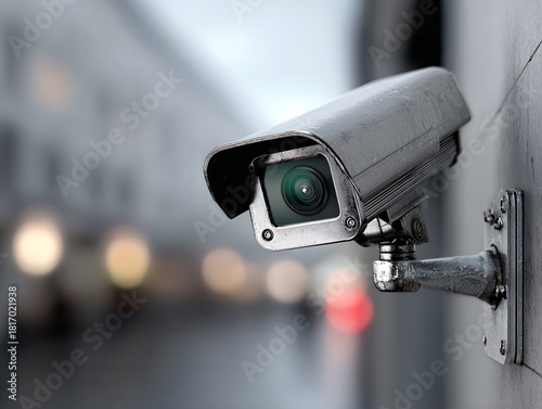 a surveillance camera mounted on a wall, with a blurred background featuring colorful lights.