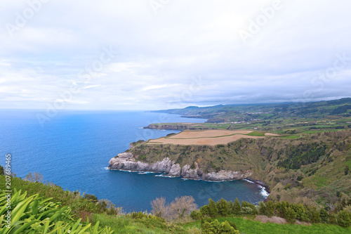 A sweeping view from one of scenic outlooks on Sao Miguel Island of Azores, Portugal. Azorean landscape of the southern coastline of the island in spring.