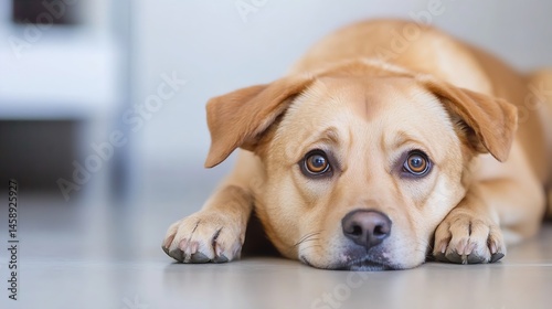 A sweet, light brown dog lies on the floor, resting its head and paws, gazing sadly at the camera with big, expressive eyes. : Generative AI