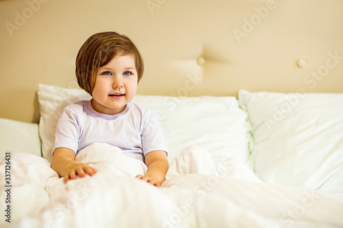 a sweet little girl with blue eyes ,lying in a white bed, under quarantine because of the covid-19 pandemic