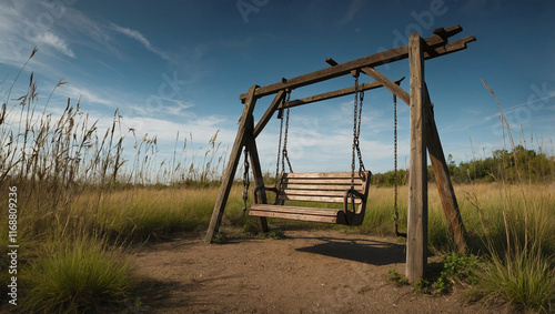 a swing is sitting in the middle of a field
