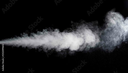 A swirl of white smoke drifts against a deep black background, creating an abstract and atmospheric effect