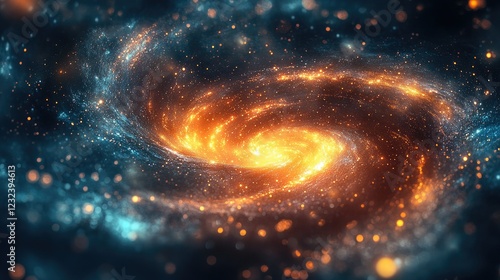 A swirling galaxy of orange and blue light with a bright center, surrounded by a dark blue background.