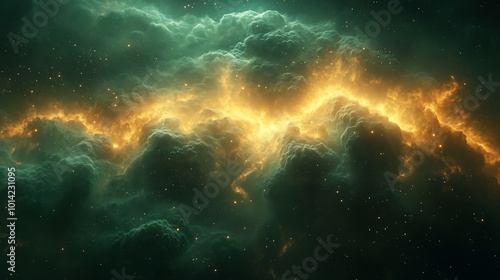 A swirling mass of nebulae in a deep space setting. The nebulae glow in shades of green and yellow, with bright spots of light scattered throughout.
