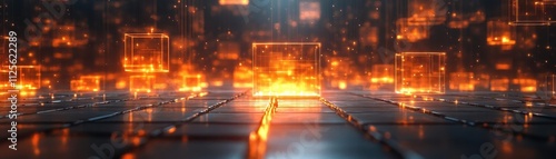 A symbolic glowing grid overlaying organized packaging systems, cinematic shadows and warm tones