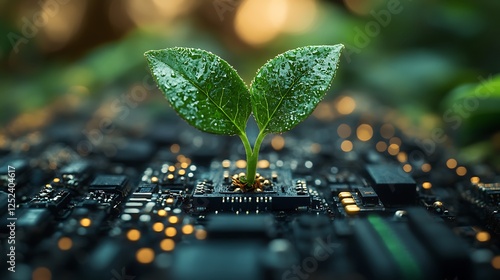 A symbolic representation of nature merging with technology through a sprout growing from an electronic component