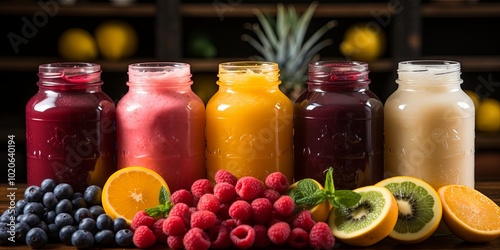 A symphony of vibrant hues, each jar holding a promise of refreshing delight, surrounded by nature's bounty.