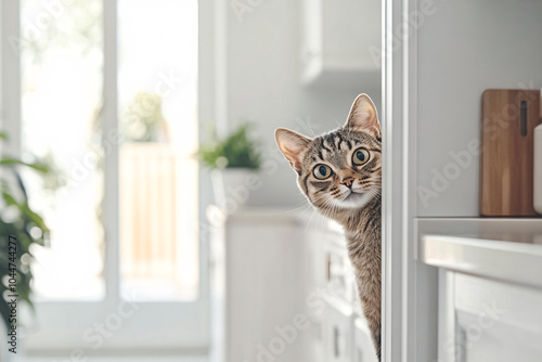 a tabby cat curiously peeks around a doorframe in a modern kitchen with white cabinets green plants and sunlight streaming in