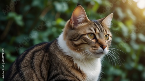 cat, felino, pet, animal, mammal, cat, kitten, outdoors, garden, nature, summer, sunlight, fur, whisker, eye, amber, brown, white, tabby, stripes, cute, adorable, lovely, pretty, beautiful, elegant, graceful, playful, friendly, happy, relaxed, calm, serene, domestic, wild, paw, tail, ear, nose, mouth, face, profile, portrait, closeup, image, photo, picture, photo