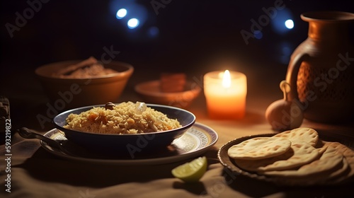 A table filled with Eid and Ramadan food represents the culinary traditions of the Islamic holy month, and is a symbol of communal gathering, hospitality, and celebration, AI Generated