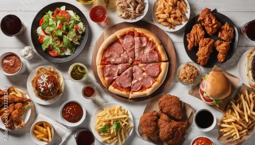 bacon, tomatoes, mustard, pizza, fries, burger, french fries, mayo, chicken breast, sauce, chicken wings, lettuce, cheese, salad, ketchup, ham, onion, sausage, chicken