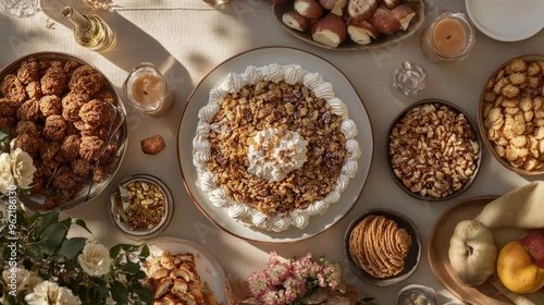 thanksgiving, food, dessert, style, holiday, celebration, autumn, table, setting, sweet, whipped, cream, granola, fruit, candle, cosy, inviting, family, gathering, seasonal, traditional, modern, baked, good, decor, fall, homemade, festive, culinary, presentation, gathering, decorative, element, flower, variety, delicious, favor, pumpkin, pecan, apple, caramel, spirit, kitchen, home, rustic, elegance