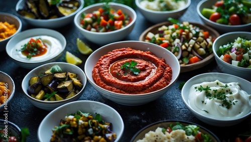 A table of appetizers showcasing traditional Turkish and Greek cuisine, with grilled eggplant salad, Baba Ghanoush, harissa, and other salads.