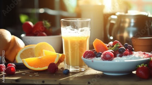 A table setting with a bowl of fresh, colorful fruit and a refreshing glass of orange juice. Perfect for a healthy breakfast or brunch