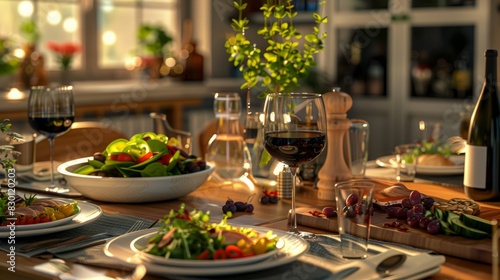 a table topped with plates of food and glasses of wine next to a bowl of salad and a glass of wine on top of a table. generative ai