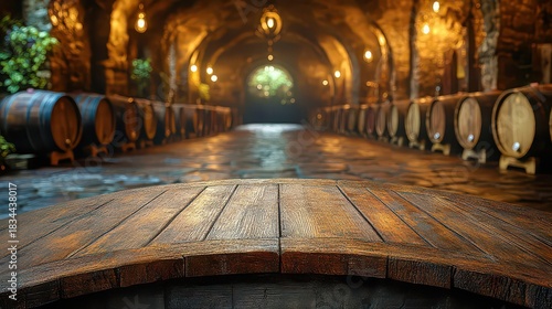A table with free space for a bottle of wine or food and a retro interior of a cellar with barrels.