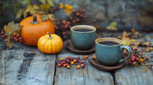 A table with two cups of coffee, surrounded by autumn flowers and berries in the background on wooden planks. A small pumpkin sits next to them. The scene is set against an old wooden wall.
