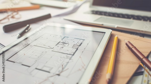 tablet, pen, laptop, design, creativity, workspace, architecture, dynamic, professional, modern, innovation, floor plan, architect, planning, engineering, blueprint, sketching, project, worktable, technology, construction plan, work in progress, technical drawing