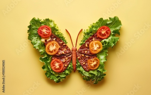 A taco styled as a butterfly, with lettuce wings and tomato slices for details on a pastel yellow background