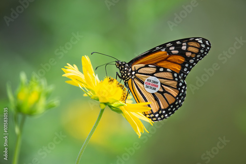 A tagged migrating Monarch butterfly (Danaus plexippus) feeding on Golden Crownbeard flowers in the autumn in Texas.