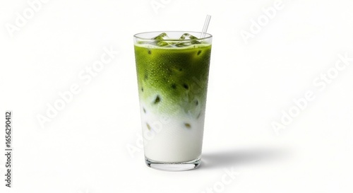 matcha, latte, drink, beverage, glasses, ice, cube, iced, cold, refreshing, green, white, layer, layered, liquid, straw, tall, isolated, background, studio, shot, food, refreshment, delicious, tasty, healthy, vibrant, colours, bright, clear, transparent, lactic, creamy, sweet, caffeine, energy, cool, minimalist, simple, plain, clean, modern, aesthetic, culinary, epicure, preparation