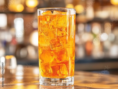 A tall glass filled with ice and a golden-orange beverage on a bar counter.