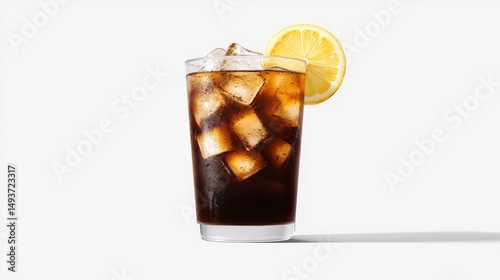 A tall glass filled with ice cubes and a refreshing dark carbonated beverage garnished with a bright yellow lemon slice against white.