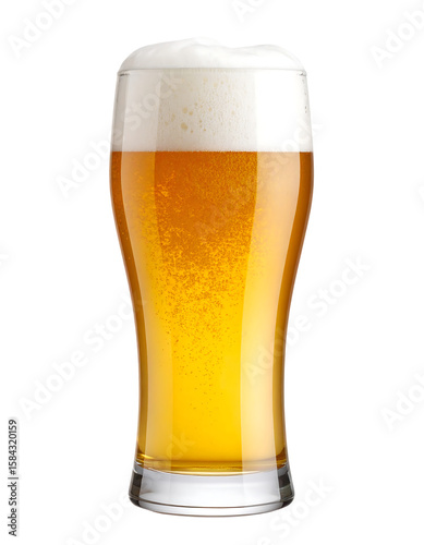 A tall glass of golden beer with a thick, frothy head, isolated on transparent background.