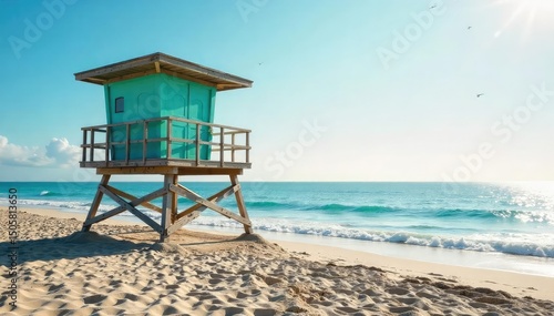 A tall lifeguard tower stands overlooking a calm ocean, providing a panoramic view of the beach and water Perfect for summer, safety, and coastal imagery , post, wood