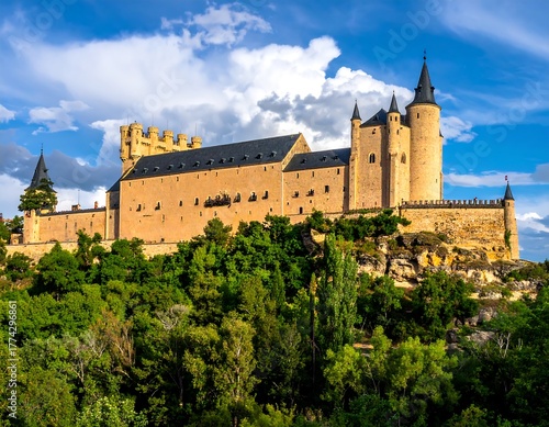 castle, architecture, building, fortress, mediaeval, historic, landmark, tour tourism, travel, sky, cloud, hill, forest, tree, landscape, nature, outdoors, vacation, destination, europa, spain, ancient, heritage, historical, historical building, vista, scenic, rural, journey, turret