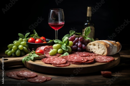 A tantalizing view of a rustic salami platter, complemented by basil, olives, and a glass of wine