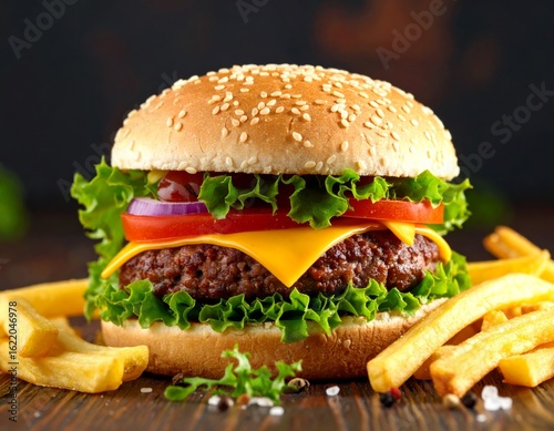 A tasty cheeseburger with grilled beef, melted cheese, and fresh lettuce, tomatoes, and onions on a sesame bun