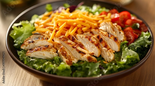 A tasty salad with roasted chicken, fresh greens, and shredded cheddar cheese. A healthy and satisfying meal option.