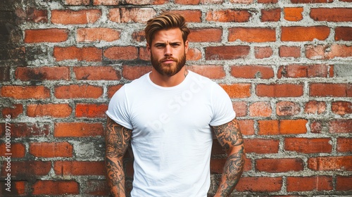 A tattooed man with a beard wearing a white t-shirt stands in front of a brick wall.