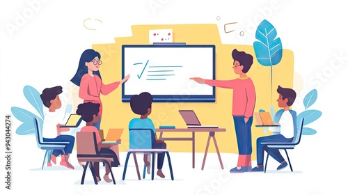 A teacher guiding students in a virtual classroom, with space for text on the smartboard.