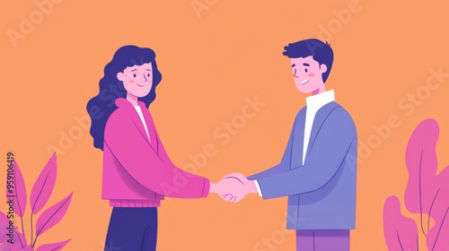 business, handshake, celebration, partnership, success, deal, agreements, teamwork, collaboration, female, male, illustration, colourful, icon, milestone, contract, interaction, smile, joy, professional, friendship, communication, modern, animated, graphic, casual attire, friendly, positive, corporate, strategy, accomplishment