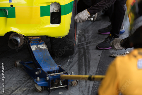 A team changing tires on a racing car on pit lane. Tire change during at pit stop