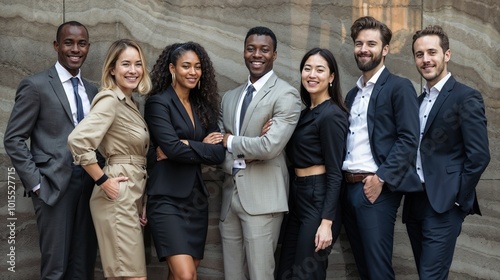 A team of diverse and smiling business professionals pose together against a modern background, showing teamwork and success.