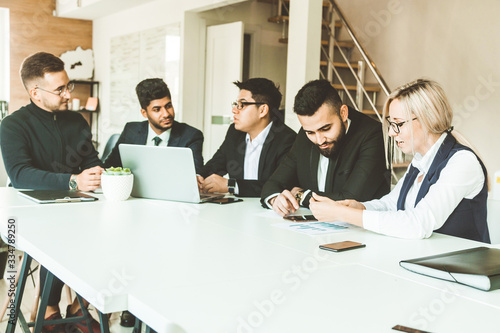 A team of young businessmen working and communicating together in an office. Corporate businessteam and manager in a meeting.