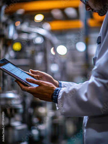 technician, tablet, industrial, laboratory, coat, equipment, monitoring, technology, modern, factory, machinery, professional, work, hand, screen, datum, control, research, production, automation, engineering, workflow, analysis, innovation, digital, environment, safety, process, quality, inspection