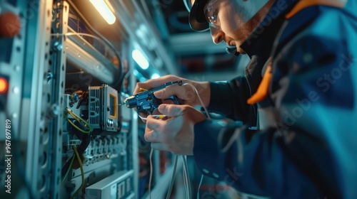 A technician working on electronic equipment, focused and precise while troubleshooting and wiring in a modern control room.