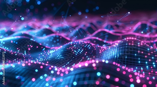 A technology background with dots on a 3D wave landscape. Data science, particles, virtual reality, cyberspace, and the metaverse are associated with this concept.
