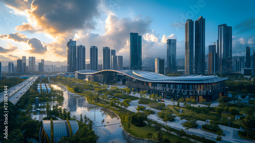 A technology hub, with sleek buildings as the background, during an innovation conference