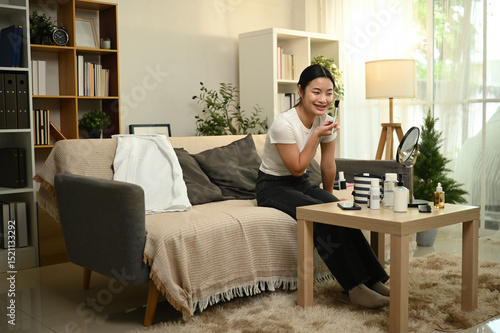 teenage, girl, daily, make-up, beauty, routine, home, living room, cosy, brush, skincare, home, lifestyle, smile, natural, product, casual attire, fun, care, elegant, confident, mirror, bottle, table, indoor, calm, relax, healthy, clean, morning, peaceful, tidy, organised, sofa, curtain, decor, personal, cosmetic, happiness, feminine, wellness, youth, trendy, neat, glow, enjoy, cute, bright, asian