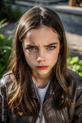 a teenage a girl with a deep scowl, eyes narrowed, and lips pressed tightly together, capturing bitterness