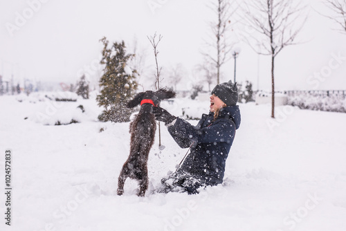 A teenage girl sits with her dog in the snow in winter, throwing snowballs at her. Russian spaniel runs with flapping ears in the snow and plays
