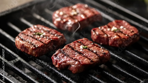 A tempting image of marbled steak cuts on a grill, sizzling and surrounded by smoke, capturing the deliciousness of cooking fresh meat