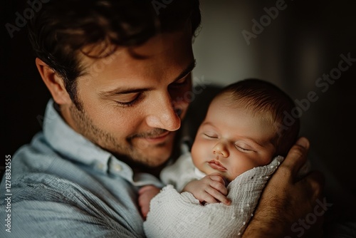 A tender moment captured between a father gazing lovingly at his peacefully sleeping newborn baby, cradled gently in his arms, symbolizing unconditional love and profound connection.